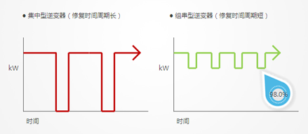 原因二:組串式逆變器還具有自耗電低、故障影響小、更換維護方便的優(yōu)勢。集中型逆變器自身耗電以及機房通風(fēng)散熱耗電大,系統(tǒng)維護相對復(fù)雜,出現(xiàn)故障時,整個電站會癱瘓,組串型逆變器出現(xiàn)故障時,只有一串組件會停止發(fā)電,整個電站可以照常運作,從而很大程度上降低了損失。另外,組串式并網(wǎng)逆變器的體積小、重量輕,搬運和安裝都非常方便,不需要專業(yè)工具和設(shè)備,也不需要專門的配電室,在各種應(yīng)用中都能夠簡化施工、減少占地,直流線路連接也不需要直流匯流箱和直流配電柜等。這就意味著組串型逆變器的修復(fù)時間周期要比集中式逆變器的修復(fù)周期短,下圖為集中型和組串型逆變器的修復(fù)時間周期對比。